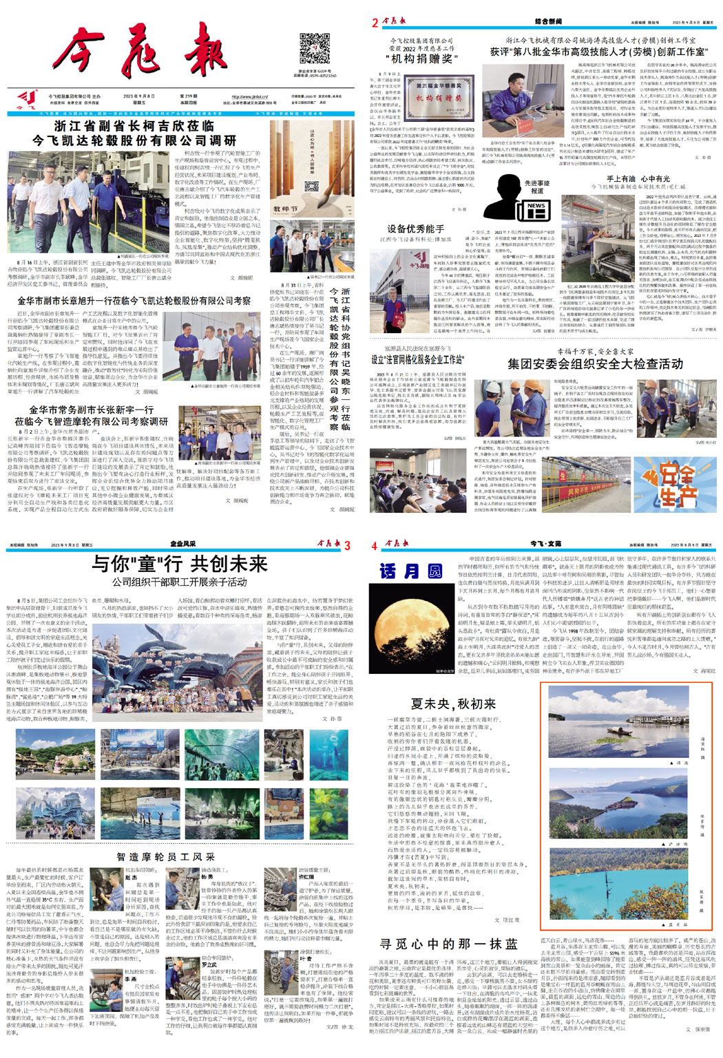 浙江省副省长柯吉欣莅临今飞凯达轮毂股份有限公司考察调研省科协党组书记吴晓东一行莅临今飞凯达轮毂股份有限公司参观考察金华市副市长章旭升一行莅临今飞凯达轮毂股份有限公司考察调研金华市常务副市长张新宇一行莅临今飞智造摩轮有限公司考察调研今飞控股集团有限公司荣获2022年度慈善工作“机构捐赠奖”浙江今飞机械有限公司姚海涛高技能人才(劳模)创新工作室一一获评“第八批金华市高级技能人才(劳模)创新工作室”设备优秀能手一一江西今飞设备科科长:傅旭滨手上有油 心中有光一一今飞机械装备制造车间技术员:毛仁威富源县人民法院在富源今飞设立“法官网格化服务企业工作站”幸福千万家,安全靠大家——集团安委会组织安全大检查活动与你“童”行 共创未来——公司组织干部职工开展亲子活动智造摩轮员工风采话月圆夏未央,秋初来寻觅心中的那一抹蓝