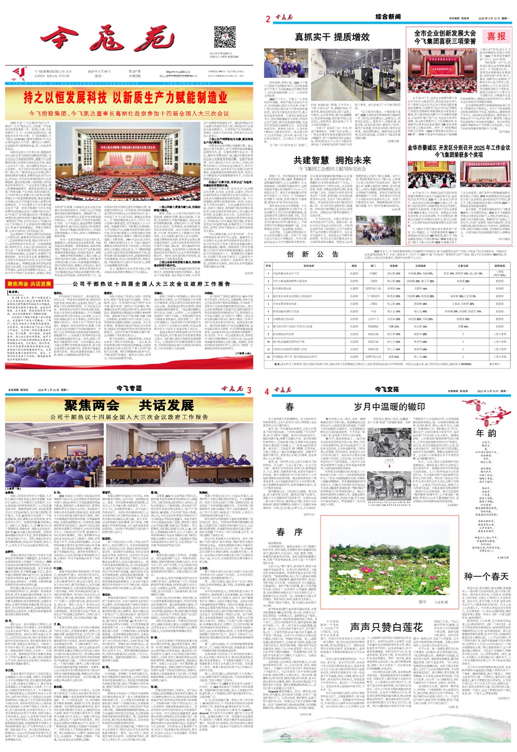 持之以恒发展科技,以新质生产力赋能制造业——今飞控股集团董事长、今飞凯达董事长葛炳灶赴京参加十四届全国人大三次会议聚焦两会 共话发展——公司干部热议十四届全国人大三次会议政府工作报告聚焦两会 共话发展——公司干部热议十四届全国人大三次会议政府工作报告真抓实干 提质增效共建智慧 拥抱未来 | 今飞集团工会组织主题写作交流会喜报|全市企业创新发展大会隆重举行,今飞集团喜获三项荣誉喜报|金华市婺城区、金华市开发区分别召开2025年工作会议,今飞集团荣获多个奖项创 新 公 告岁月中温暖的辙印春 序年 韵种一个春天声声只赞白莲花